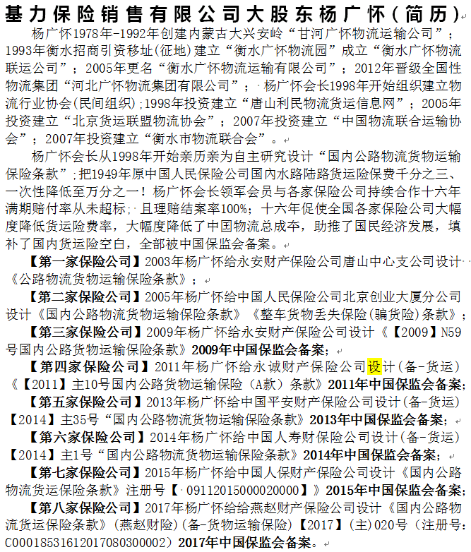 基力保险销售有限公司大股东杨广怀(简历)